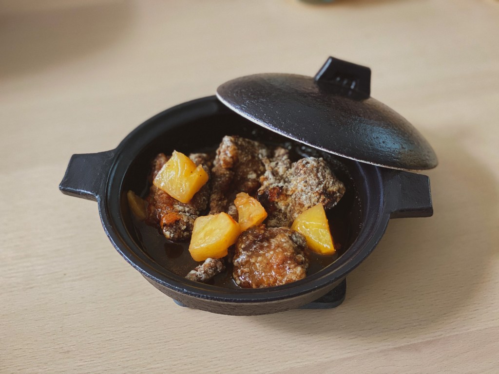 The “traditional” way of serving this dish is to toss the fried pork with the sauce. I prefer to serve the two elements separately. This way, the pork stays crispy and people can control how much sauce to use.
